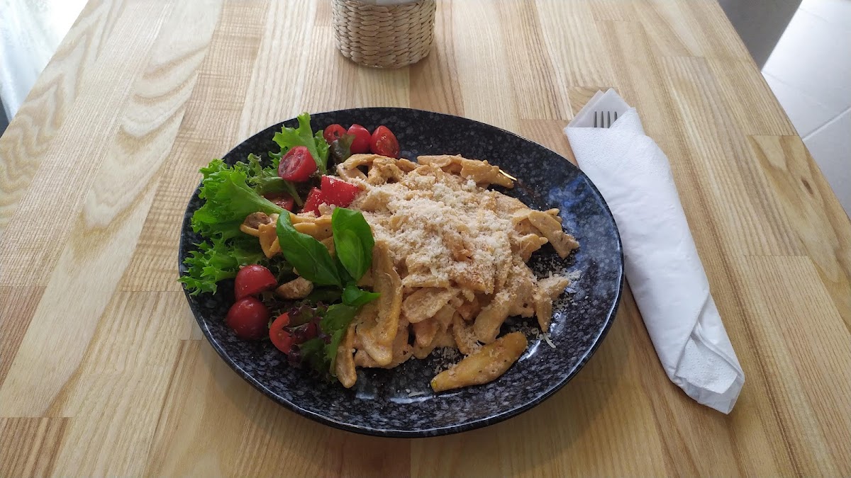 Nice cafe with friendly service. We had the chicken pasta and baked avocado with salmon. We never imagined baked avocado would be good, but it was fine. Coffee was also good. It is very kid friendly place with games and swinging chairs.